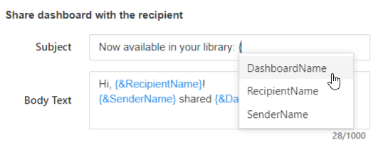 The subject and body text are automatically created for different notification types, using dynamic text to include the dashboard name, recipient name, and other information. To view a list of dynamic text, click the information icon