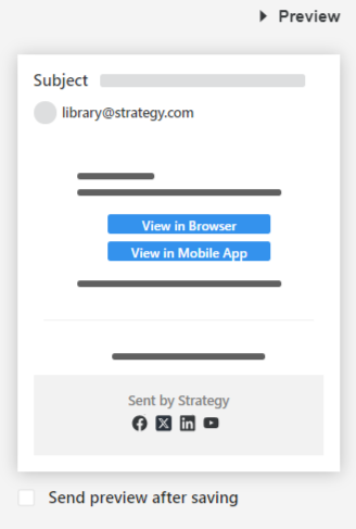 Beginning in Strategy One (June 2025), you can determine whether links to update the subscription and unsubscribe are included in the subscription email. The update subscription link opens the subscription in Strategy Library. The unsubscribe link opens Strategy Library and automatically unsubscribes the user. These links work in the Library browser on a computer or mobile device, not in the Library Mobile app. In addition, the user must have the correct privilege to update the subscription and the subscription must allow recipients to unsubscribe.