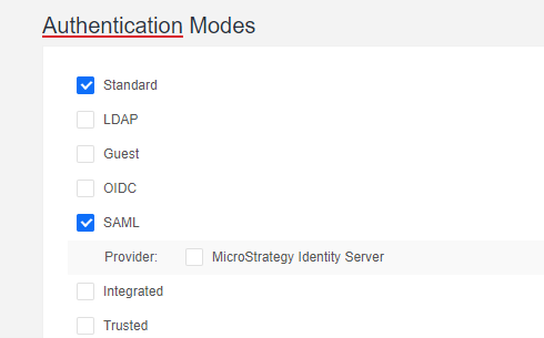 - If you are using a version prior to Strategy One (April 2025), go to the Library Admin control panel and under Authentication Modes, select Standard and SAML.