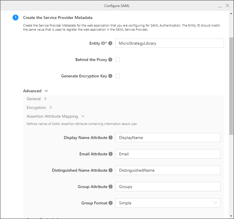- In step 1 of the Configure SAML Workstation dialog, expand the Advanced then Assertion Attribute Mapping menu options and paste the URI in Group Attribute.