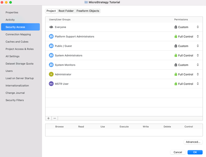 - Click Advanced Security Access to change permissions for multiple users and groups all at once. When complete, click OK to return to the main Security Access page.