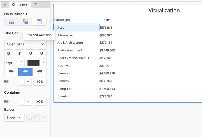All properties in the Title and Container format panel are supported except for the toggle title bar status.