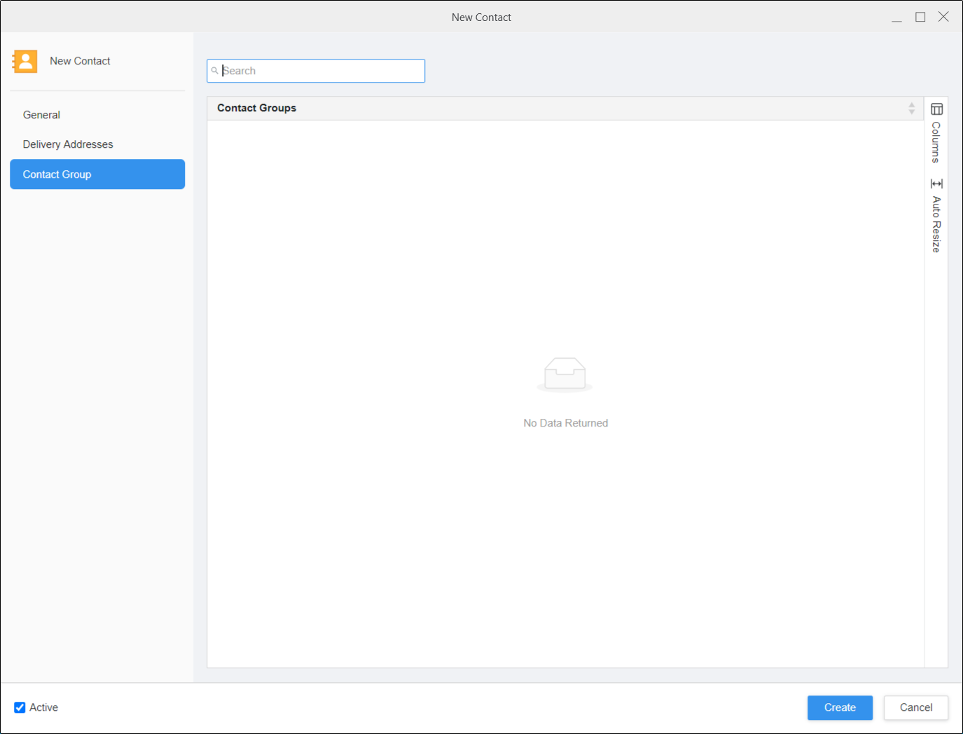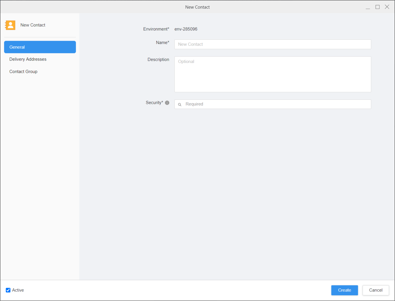 .GeneralEnter the name and description for the contact group. Security for a contact is defined by the user account which is linked to the contact. The security of the user is applied to the contact for all the projects.