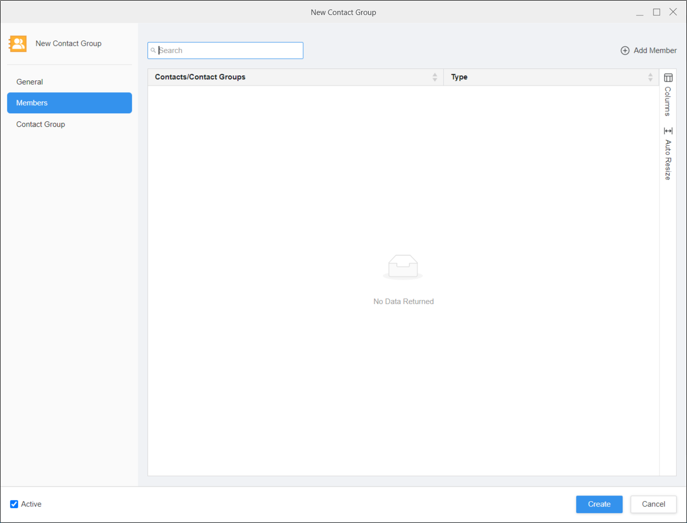 MembersDisplays a list of contacts and contact groups that are a member of this contact group. You can add a new contact to the contact group, as well as add or remove existing contacts and contact groups for this contact group. Click