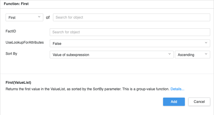 You can also add a function by hovering over it and clicking Add with Details. The corresponding dialog provides additional guidance for modifying the function parameters prior to modifying the formula.