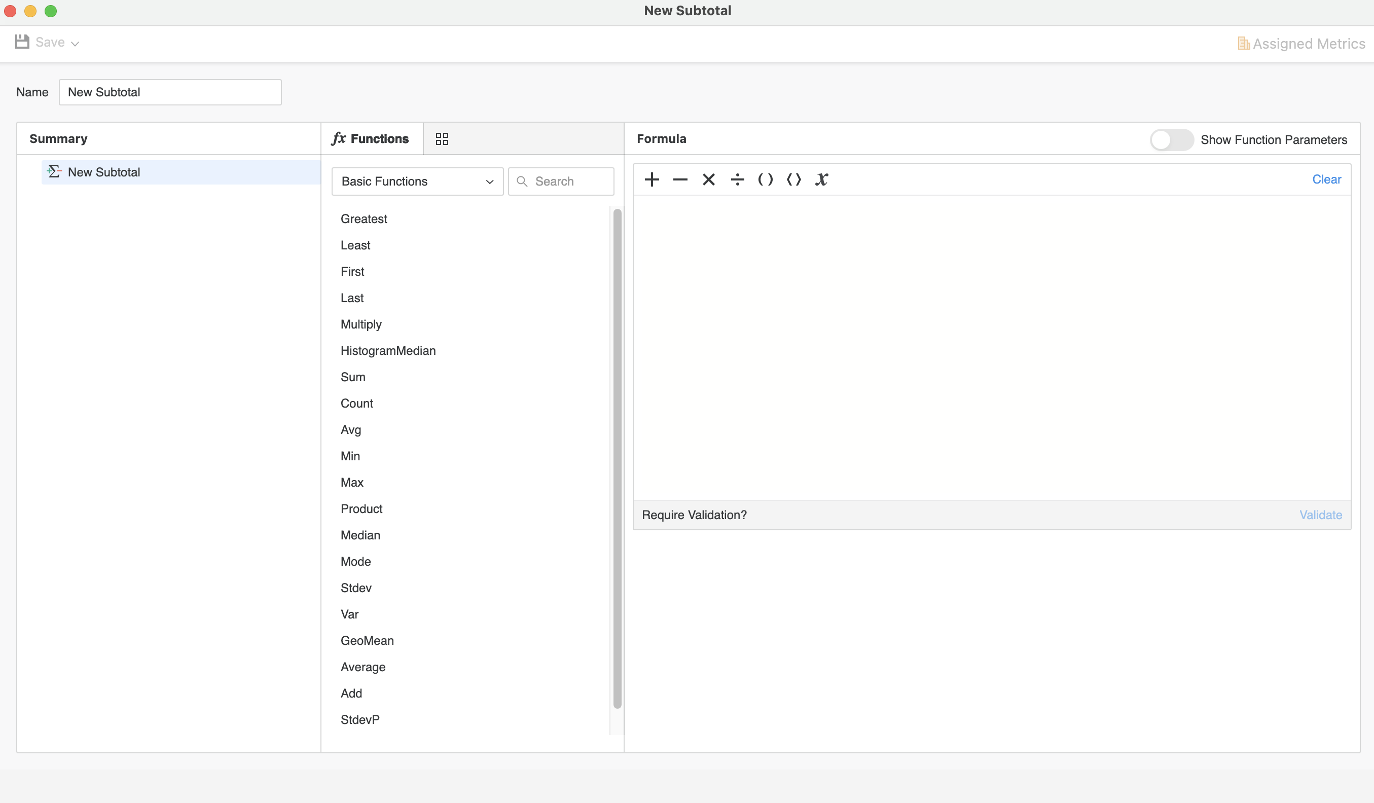 Build your formula and Validate it when you are finished. Remember that x is the placeholder for the metric to be subtotaled in your report.