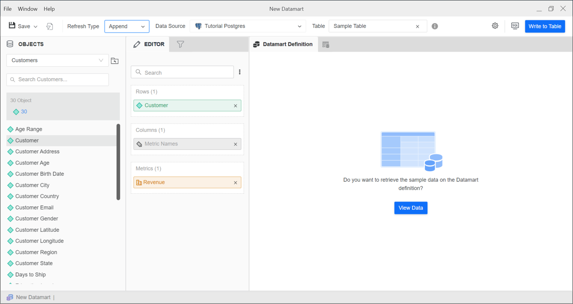 If you select Append in Refresh Type, click View Data to preview the information your datamart object will store.
