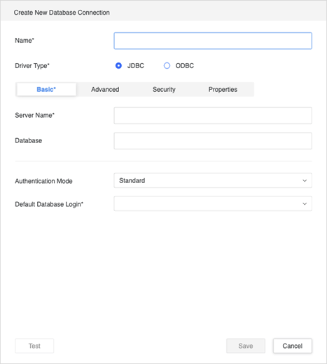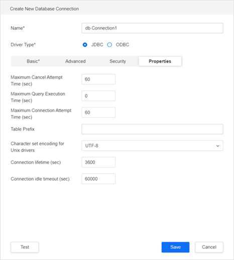 PropertiesAfter completing all fields, click Test and Save your connection.