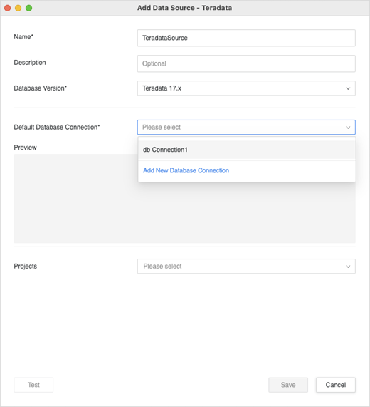 Name the data source, choose the Database Version, and select a Default Database Connection or create a new one.