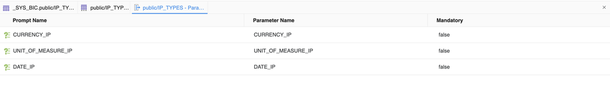 Click the table to open the preview panel. The third tab displays SAP HANA parameters. There are three fixed columns: Prompt Name, Parameter Name, and Mandatory. Each row is represented as an input parameter on the table.