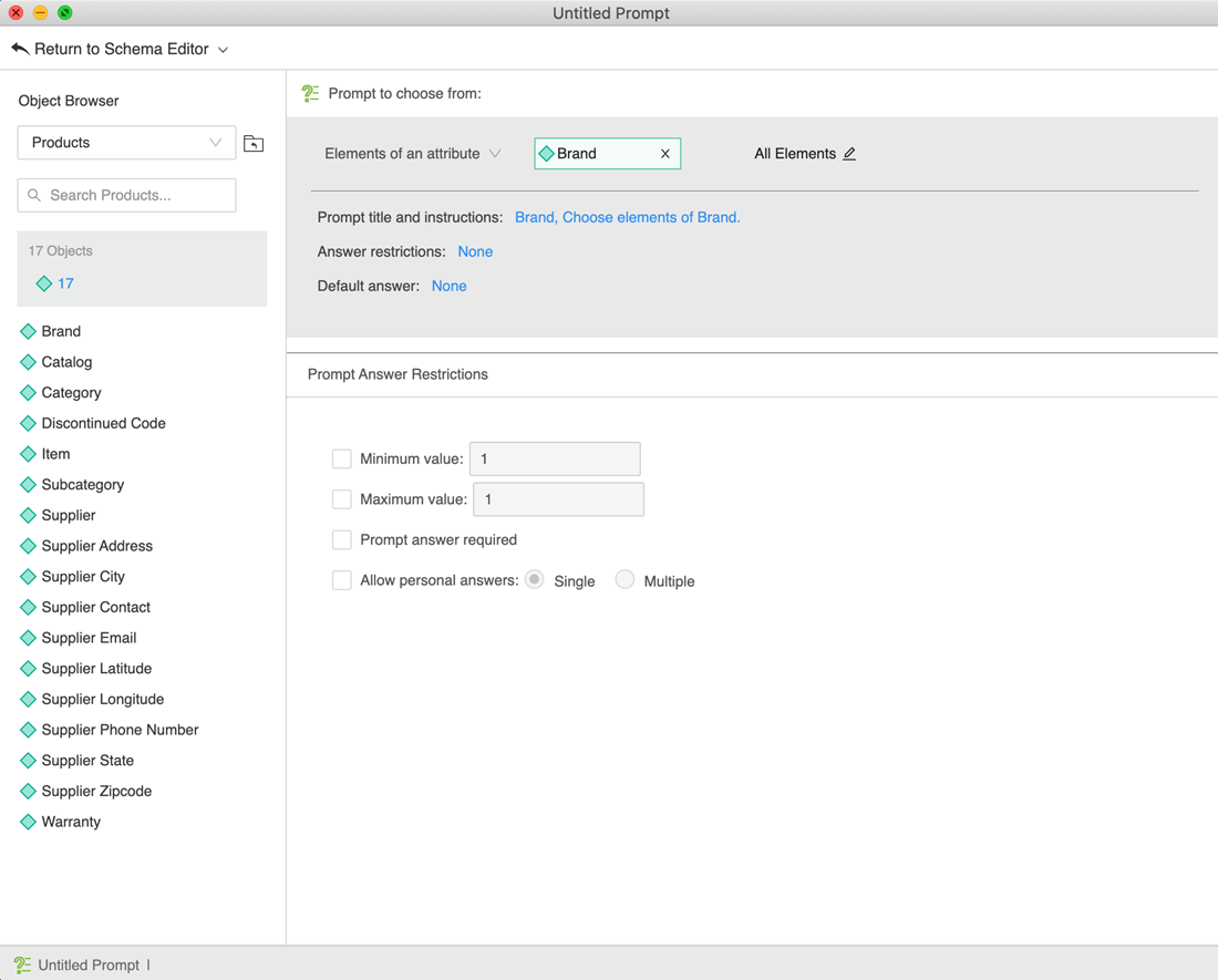 Select an attribute and complete the required fields. For more more information, see Create a Value Prompt to Select a Single Value and Create an Object Prompt to Select Objects to Display on a Report.