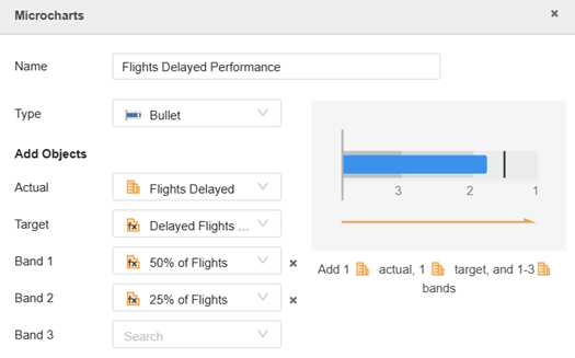 • The bullet microchart provides a quick view of performance against a target. It displays as a horizontal bar that represents the actual value, a target marker that indicates the goal, and at least one band. Use the bands to show performance thresholds such as good, average, and poor; interim targets, or a way to evaluate the actual metric's progress toward the target. The example below tracks the performance of delayed flights against a goal, with bands marking 1/3 and 2/3 towards the goal.