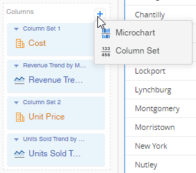 • To create a column set, in the Editor panel, click Add Microcharts/Column Set and select Column Set. Drag and drop attributes and metrics to the new column set drop zone.