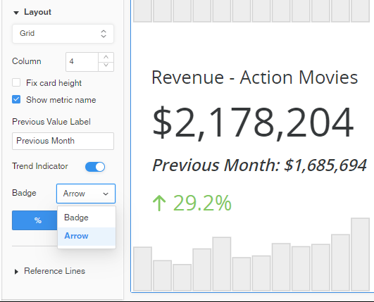 Use a Multi-Metric KPI to provide a quick performance indicator for two or more metrics.