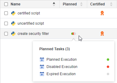 In the Scripts window, a Planned column displays. Right-click in the Planned column of a script to view a list of planned tasks associated with the script and their status, as shown below: