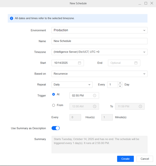Starting in Strategy One (October 2025), you can translate schedule names and descriptions. You can also choose to set a custom time zone at the schedule level or use each recipient’s own time zone for email subscriptions. Setting the custom time zone is included in the steps below. Using each recipient's time zone is included in Create Email Subscriptions.