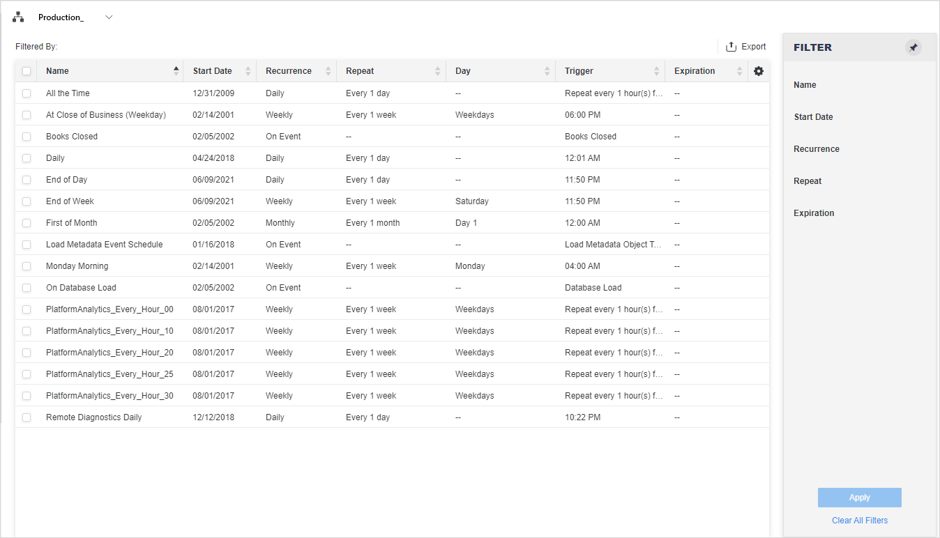 Filter Panel Lists Name, Start Date, Recurrence, Repeat, and Expiration. You can make multiple selections from this filter and apply them to the grid. The filter summary appears at the top of the grid, and you can remove elements or clear all filter selections from there.