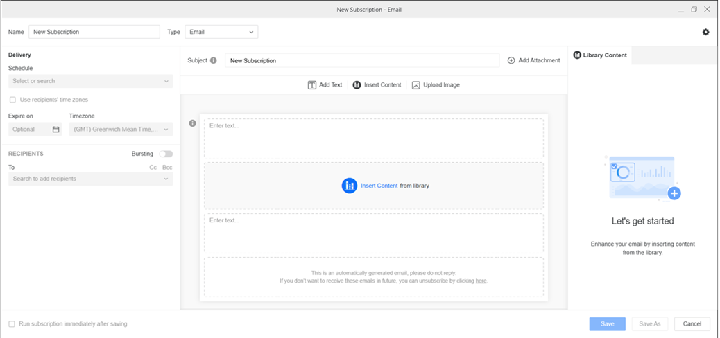 In Subject, enter a brief description to help recipients quickly identify the content being delivered. Starting in Strategy One (June 2025), you can customize the subject by adding dynamic text such as date, recipient, project, attributes, or metrics.