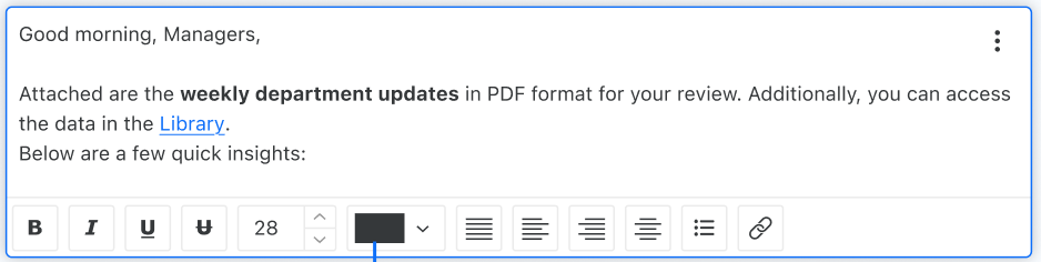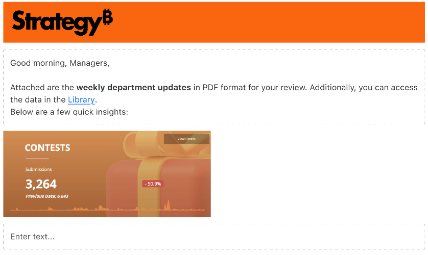 Starting in Strategy One (June 2025), you can enhance the email body by adding visualizations, images or logos, rich text, and dynamic text that pulls data from attributes and metrics. Additionally, end-users have the option to unsubscribe from future email deliveries.