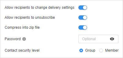 Click here to learn more about the contact security level.The contact security level is the security level used for your contacts. Contacts can have their own member security or you can choose to have each contact inherit from their respective contact group. Contacts and contact groups are assigned to a given user and inherit the privileges of the user to which they are assigned. These privileges determine what a given recipient is able to see when they receive the subscription.