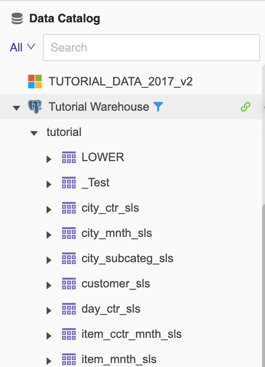 - In the Data Catalog, click on a data source name to connect to it. Choose one namespace and click Connect. Expand the namespace to locate warehouse tables or use the search
