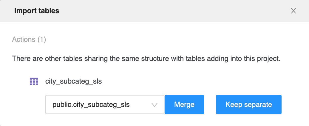 If you add a table with the same namespace and table structure as one existing table in the schema, but it has a different data source, click Merge to add secondary data source for the existing table or Keep separate to create a new table.