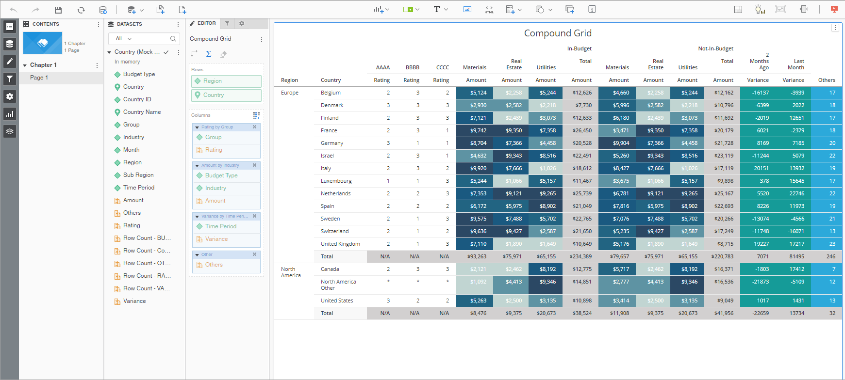 A compound grid is a visualization that allows you to build complex grids that analyze different aspects of data across a common dimension. This means you can have multiple unrelated attributes and metrics in different sets of columns that are then stitched together in one grid. Each column set can appear differently as thresholds, advanced filters, and formatting can be applied to each set.