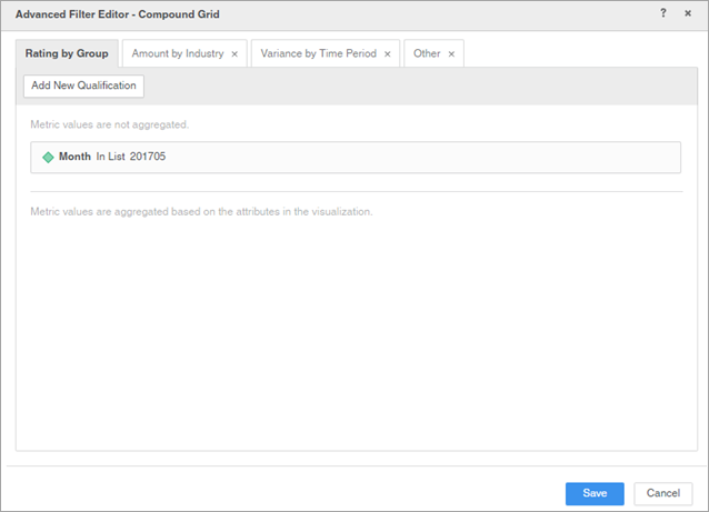 8. To add an advanced filter for a specific column set, click More in the upper right corner of the visualization and choose Edit Filter. Select a column set and click Add New Qualification. See Manage Qualifications for an Advanced Filter for information on adding qualifications.