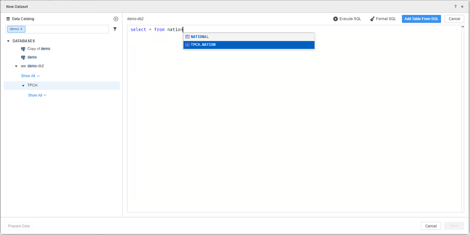 - When you use freeform SQL mode, the drag and drop functionality to add tables is not available. You must manually input a query in the workspace to add tables. You must set up a connection and choose the namespace to enable a table to auto-complete while you type a query. Certain punctuation marks, such as quotation marks or square brackets are not included in the auto-complete process.