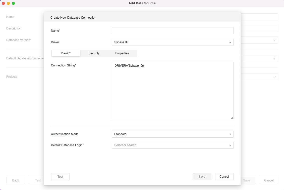 - If using Standard, enter a Default Database Login. If using OAuth or Single Sign-On, enter an Authentication Service.