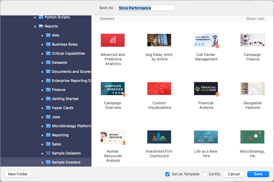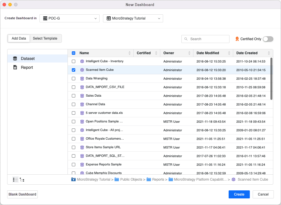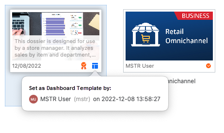 Starting in MicroStrategy 2021 Update 8, Application Architects can define any dashboard as a template. Additionally, administrators or architects can set a template as the default for a project. Templates provide a starting point to users creating content, as they can contain a predefined layout, corporate logo, cover image or even one or more datasets, thus guiding the user and ensuring they adhere to corporate standards. When creating new dashboards, users are presented with an interface that gives them the option to first select a dataset, and then select one of the templates to which they have access.