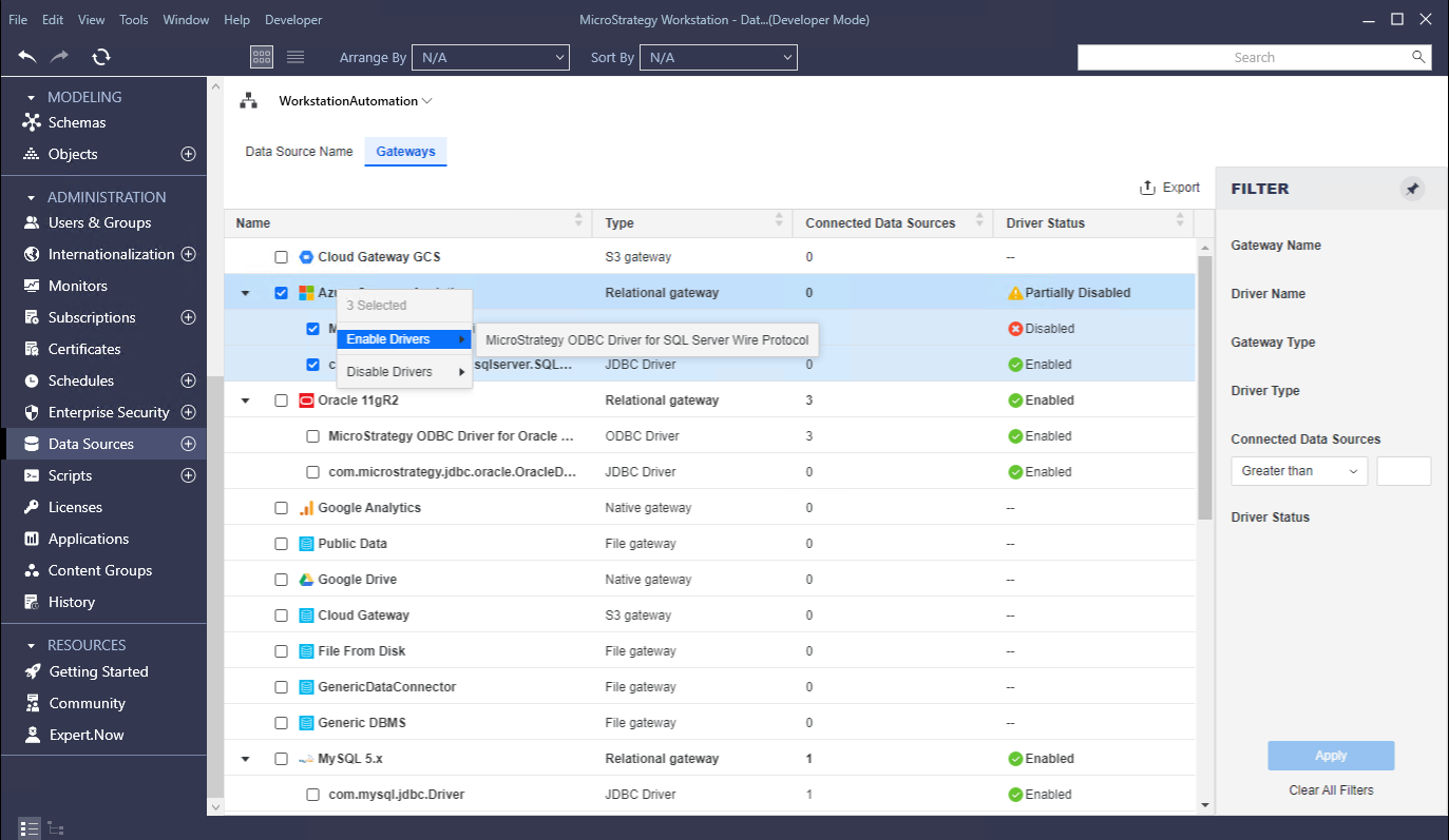 Strategy relies on drivers to connect to data sources, which provide data for analytics. The Gateways panel allows Administrators to disable drivers with vulnerabilities.