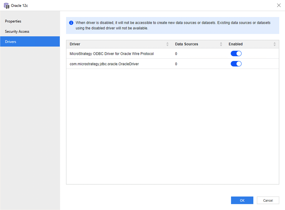 If a user adds or chooses a database connection with one disabled driver in the Add Data Source or Edit Data Source window, a warning message appears that indicates an associated driver is disabled. The following warning messages can appear: