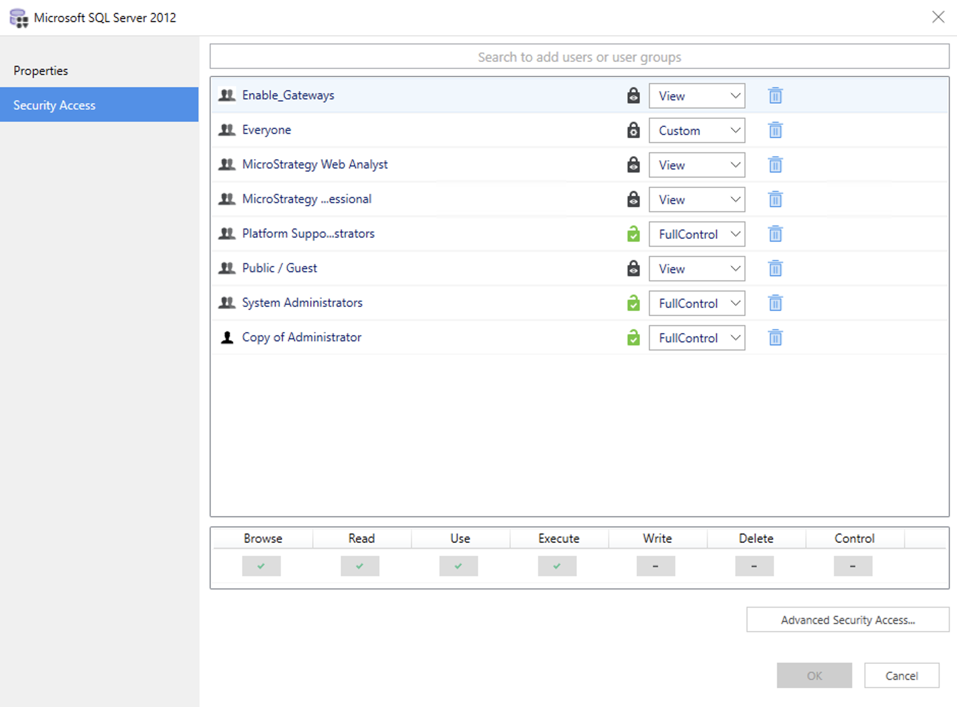 Administrators can set gateway security access for a specific users or groups. They can set which gateways are inaccessible when a user or group fetches data.