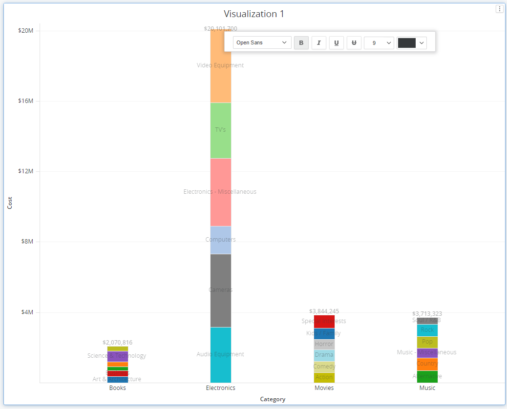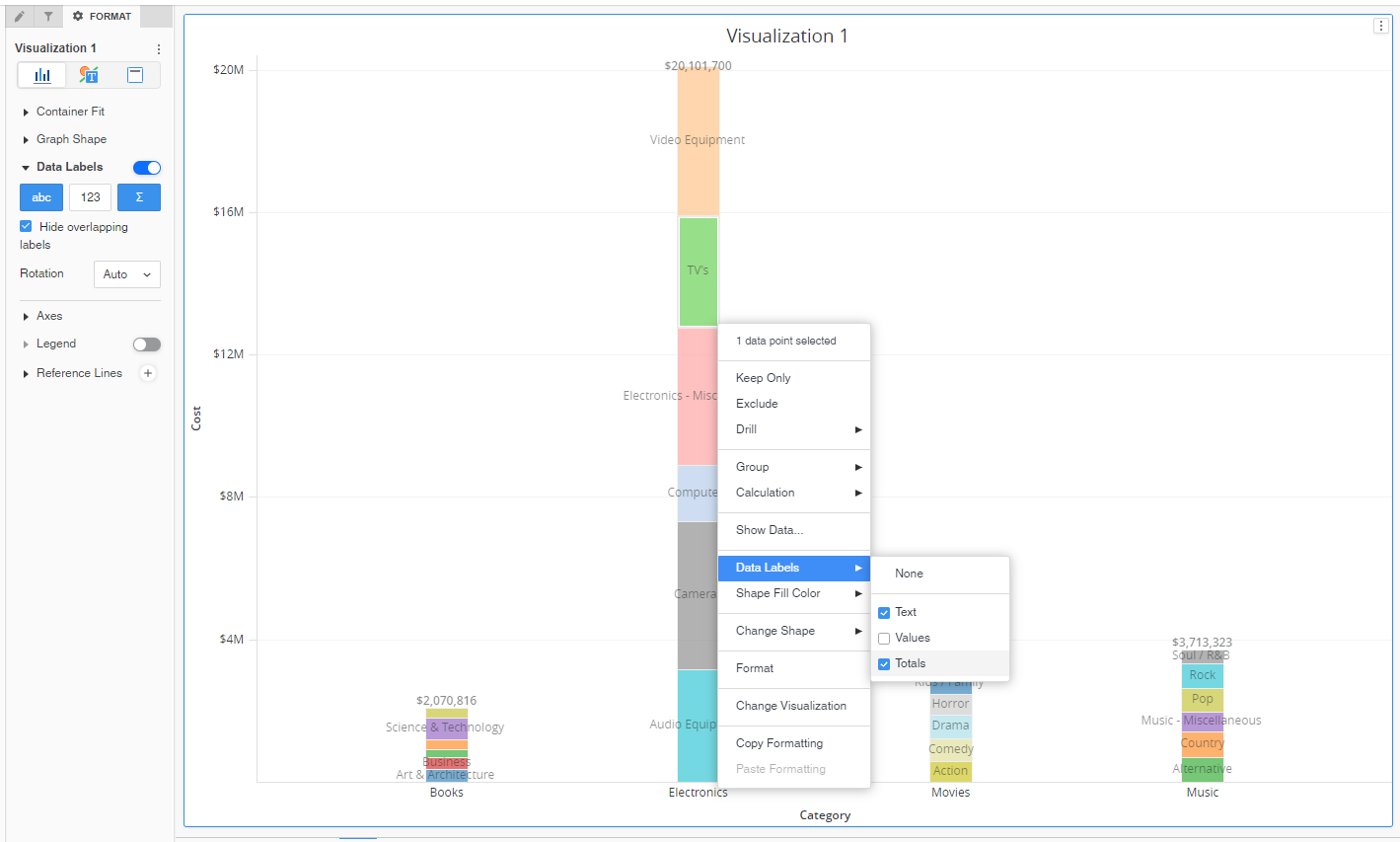 Starting in MicroStrategy ONE Update 12, analysts can display data labels for each break-by section, as well as the top total, within stacked bar charts.