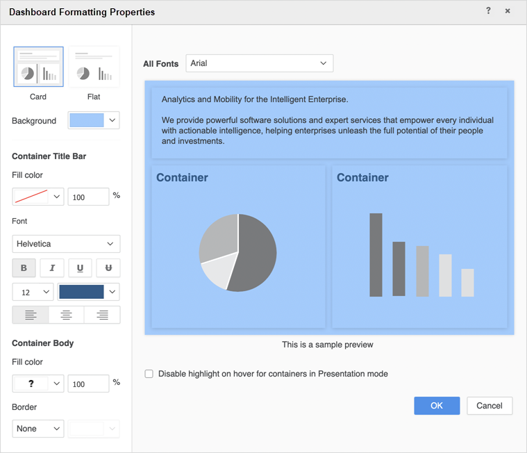 All properties in Title and Container on the Format panel for visualizations and components are supported, except the on/off status of the title bar.