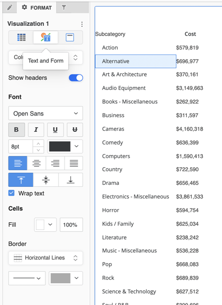 The majority of the properties in Text and Form on the Format panel for visualizations and components are supported. Some properties that are strongly data dependent are not supported, such as Reference Line, Trend line, and Color By in graphs. Some properties that determine an on/off status and are not format related are not supported, such as the on/off toggle for Data Labels.