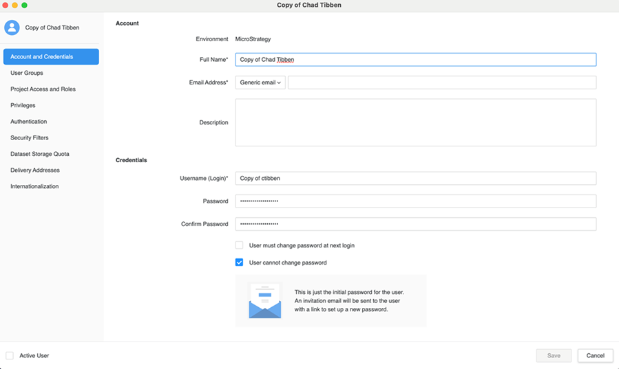 Starting in Strategy 2021 Update 8, you can duplicate user accounts to mimic access privileges. Duplicating a user profile eases the user creation work flow for multiple users that require the same access privileges. Duplicate user accounts have the same user groups, security roles, and privileges as the original user account.