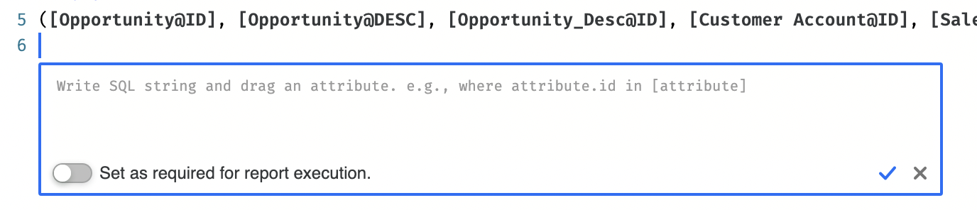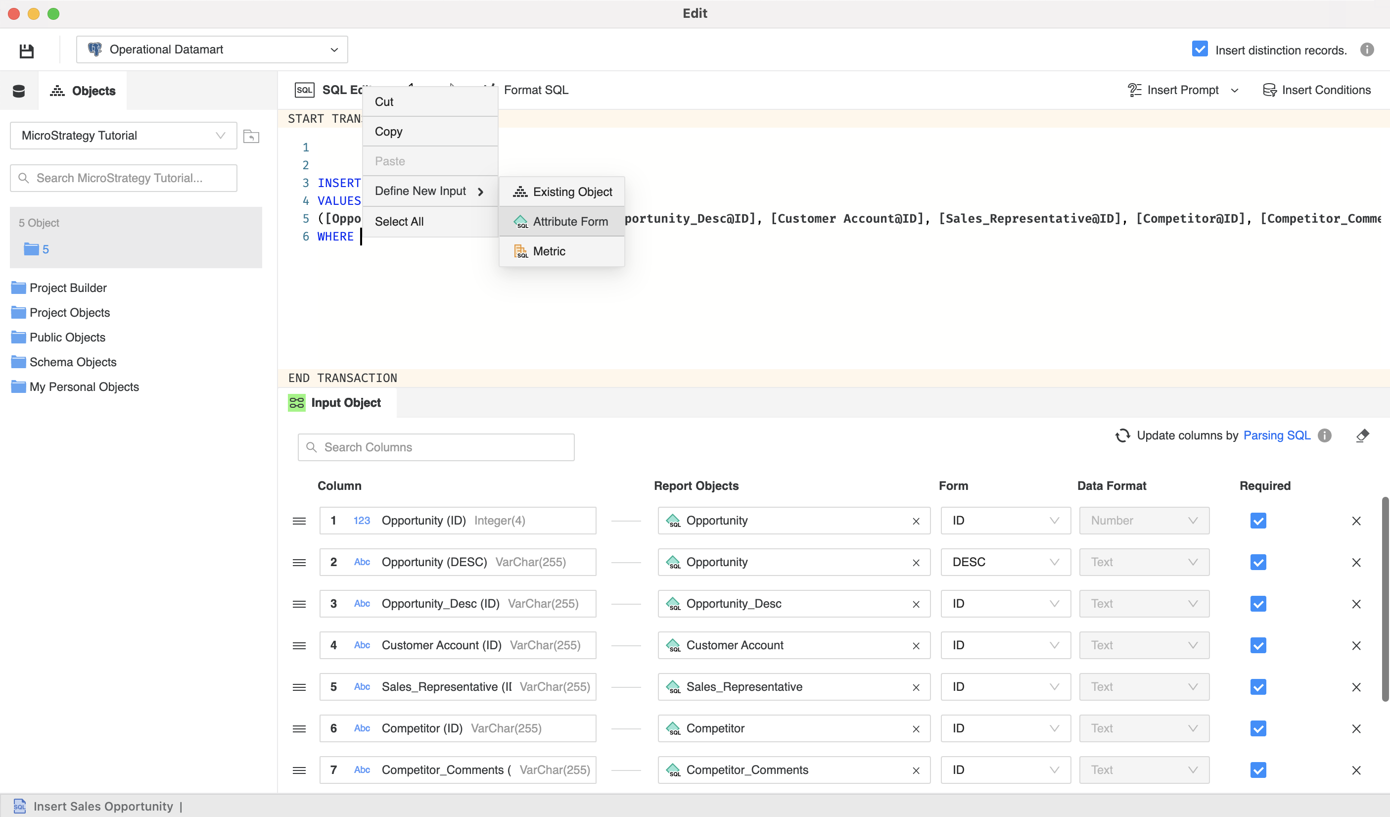 Right-click in the SQL Editor to define new input for transactions with either an existing attribute or metric, or by creating one.