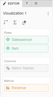The Editor panel contains a list of all the attributes and metrics that display as data in the selected object. To view the dataset objects for a specific object, click it in the Layout area.