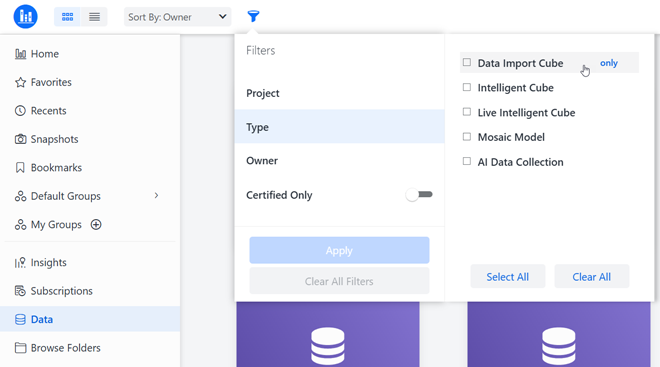 .In the Data section, you can easily filter for different types of datasets, such as data import cubes, intelligent cubes, and live intelligent cubes, as shown below: