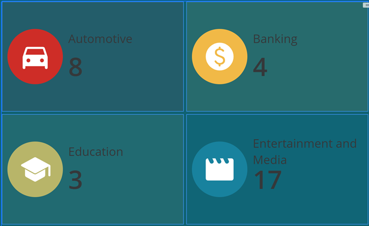 An iconic KPI can display multiple cards, one for each metric or attribute element on the KPI. In the example below, the same metric (number of accounts) breaks by the Industry attribute. Each attribute element (Banking, Education, and so on) displays as a separate card in the same KPI.