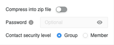 . Here you can set the contact security level, as well as choose the compression and zip file password.Click here to learn more about the contact security level.The contact security level is the security level used for your contacts. Contacts can have their own member security or you can choose to have each contact inherit from their respective contact group. Contacts and contact groups are assigned to a given user and inherit the privileges of the user to which they are assigned. These privileges determine what a given recipient is able to see when they receive the subscription.