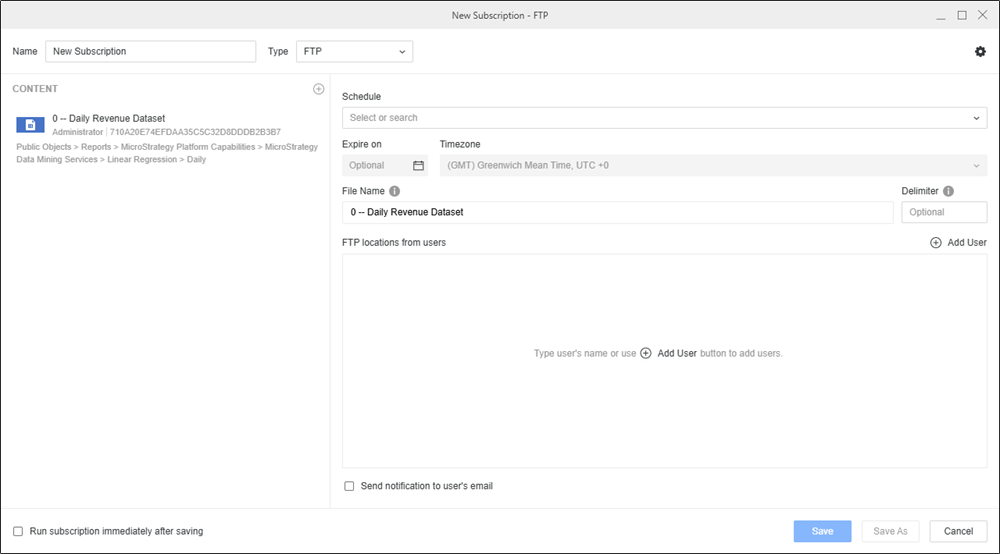 Starting in the MicroStrategy 2021 Update 6 July monthly release, Strategy Workstation allows you to create FTP subscriptions through Distribution Services. You can select one dashboard, document, or report to be delivered through an FTP device, define a schedule and message, and specify settings for the subscription object.