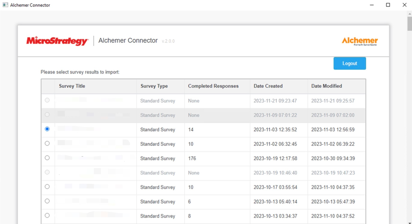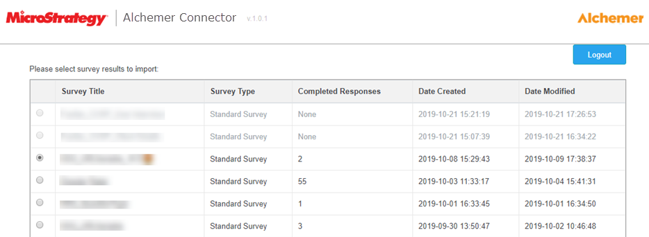 - Upon successful authorization, you are redirected to a data import page displaying a list of your surveys.