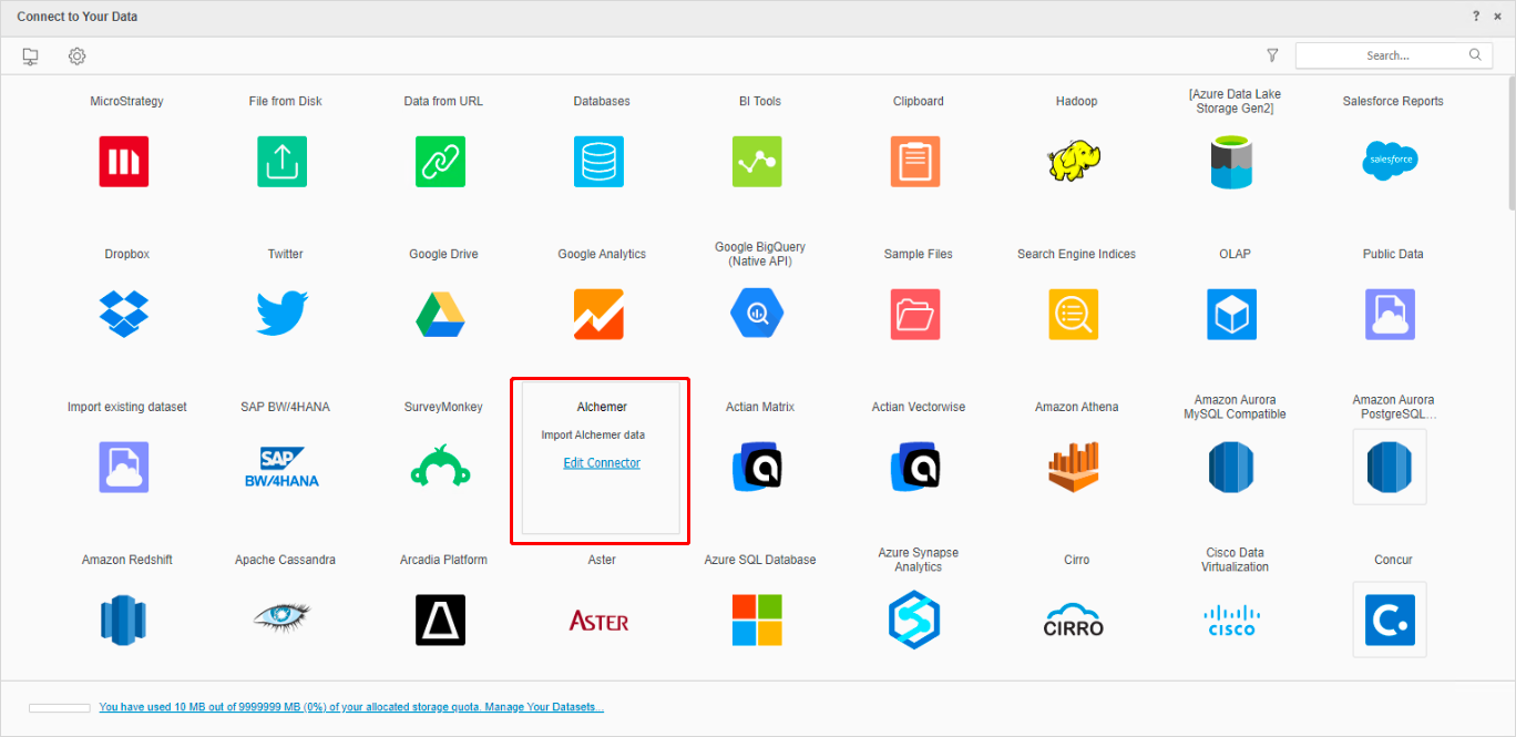 Starting in MicroStrategy ONE Update 12, you can use the Alchemer connector as part of the new data import experience. If you are using a version earlier than MicroStrategy ONE Update 12, see Use the Alchemer Connector Before MicroStrategy ONE Update 12.