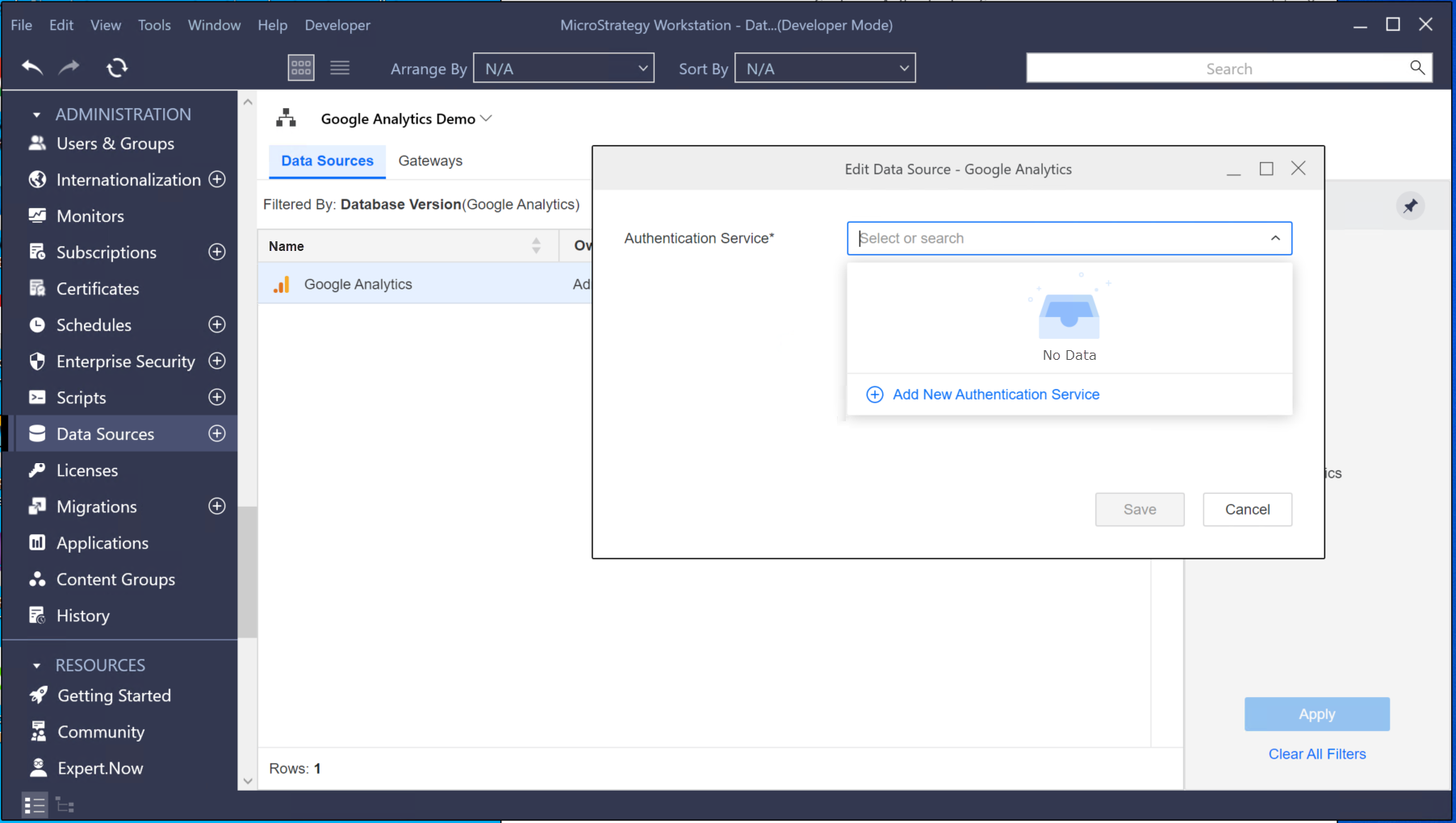 Right-click the Google Analytics data source to edit it and click Add New Authentication Service.