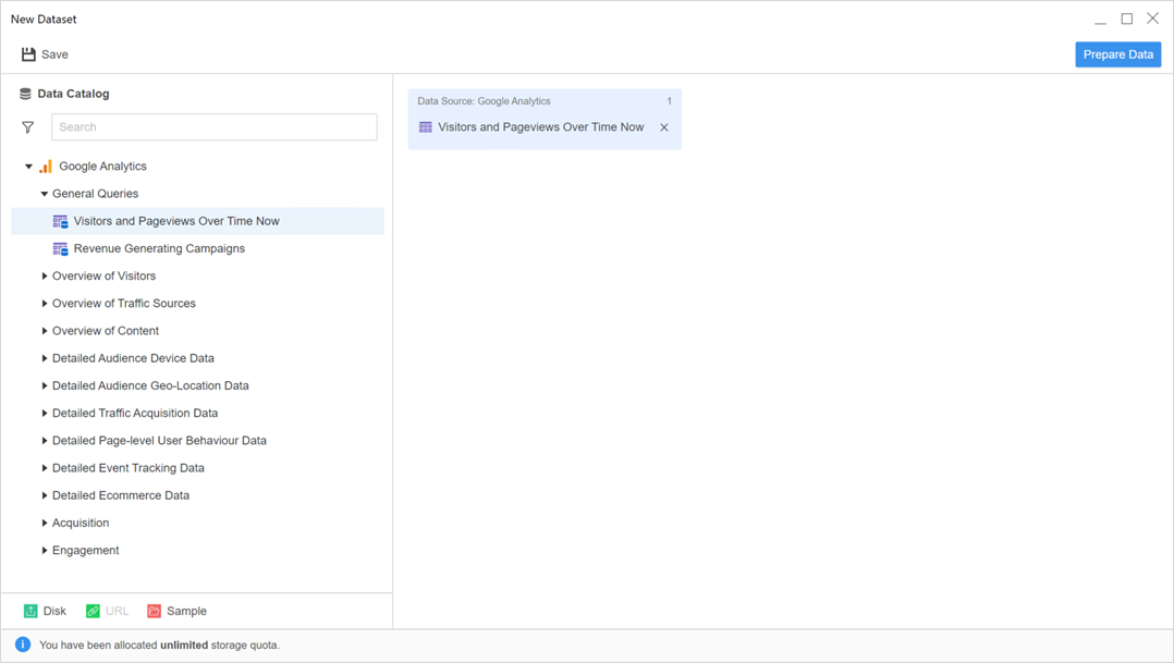 Find the Google Analytics data source, select it, and enter your Google credentials in the pop-up.