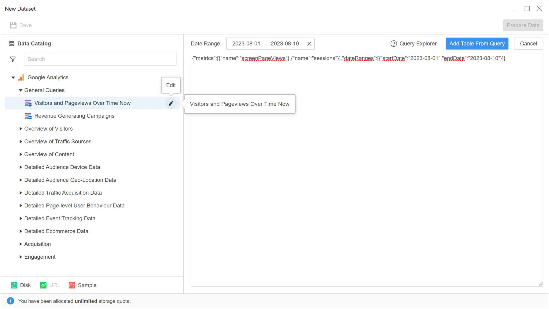 Hover over the Google Analytics data source and click Add Custom Query