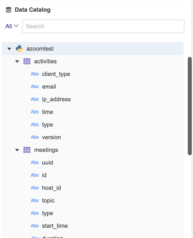 All the available Python data source connections are listed in the Data Catalog. Select or search a data source connection.